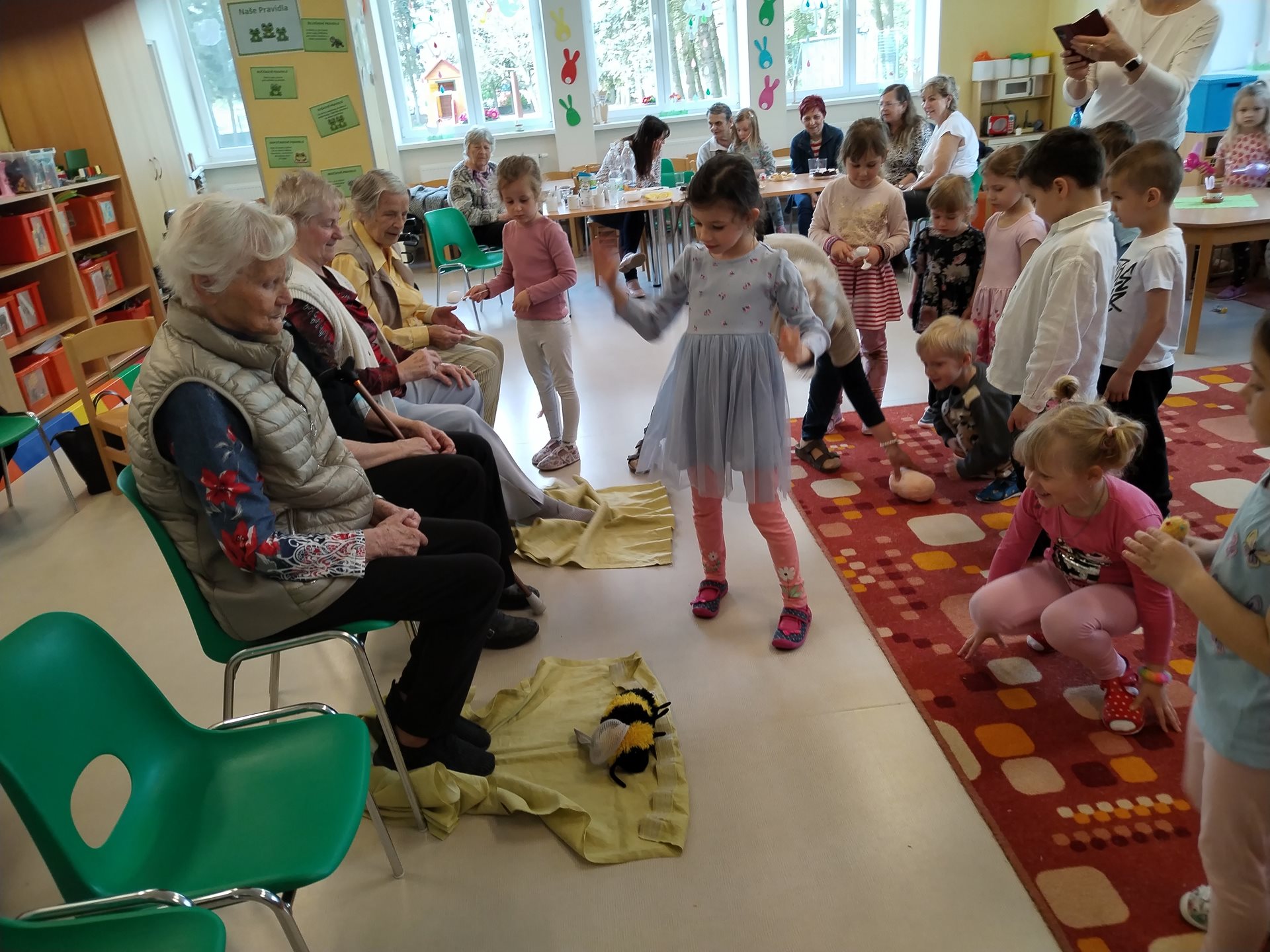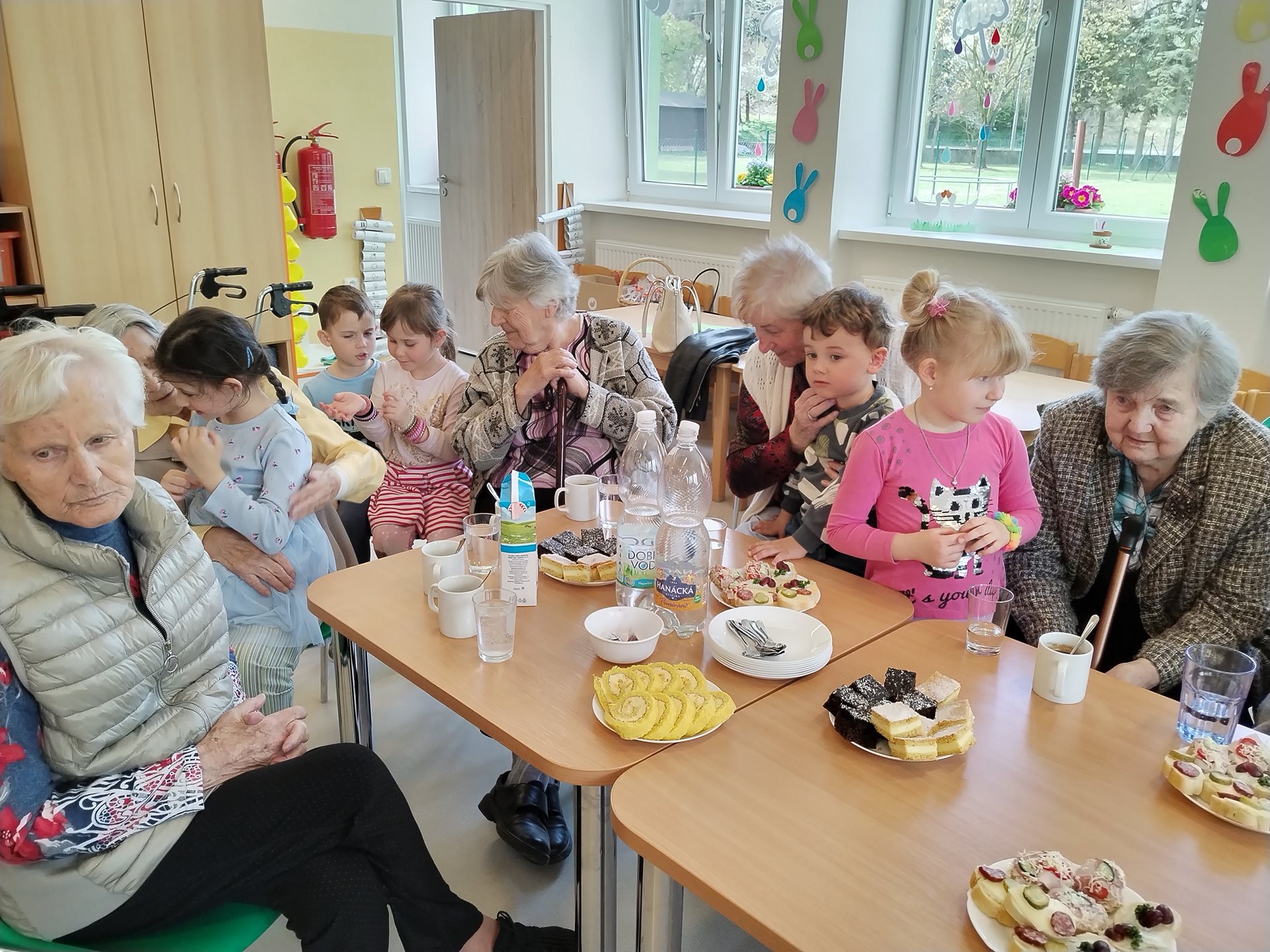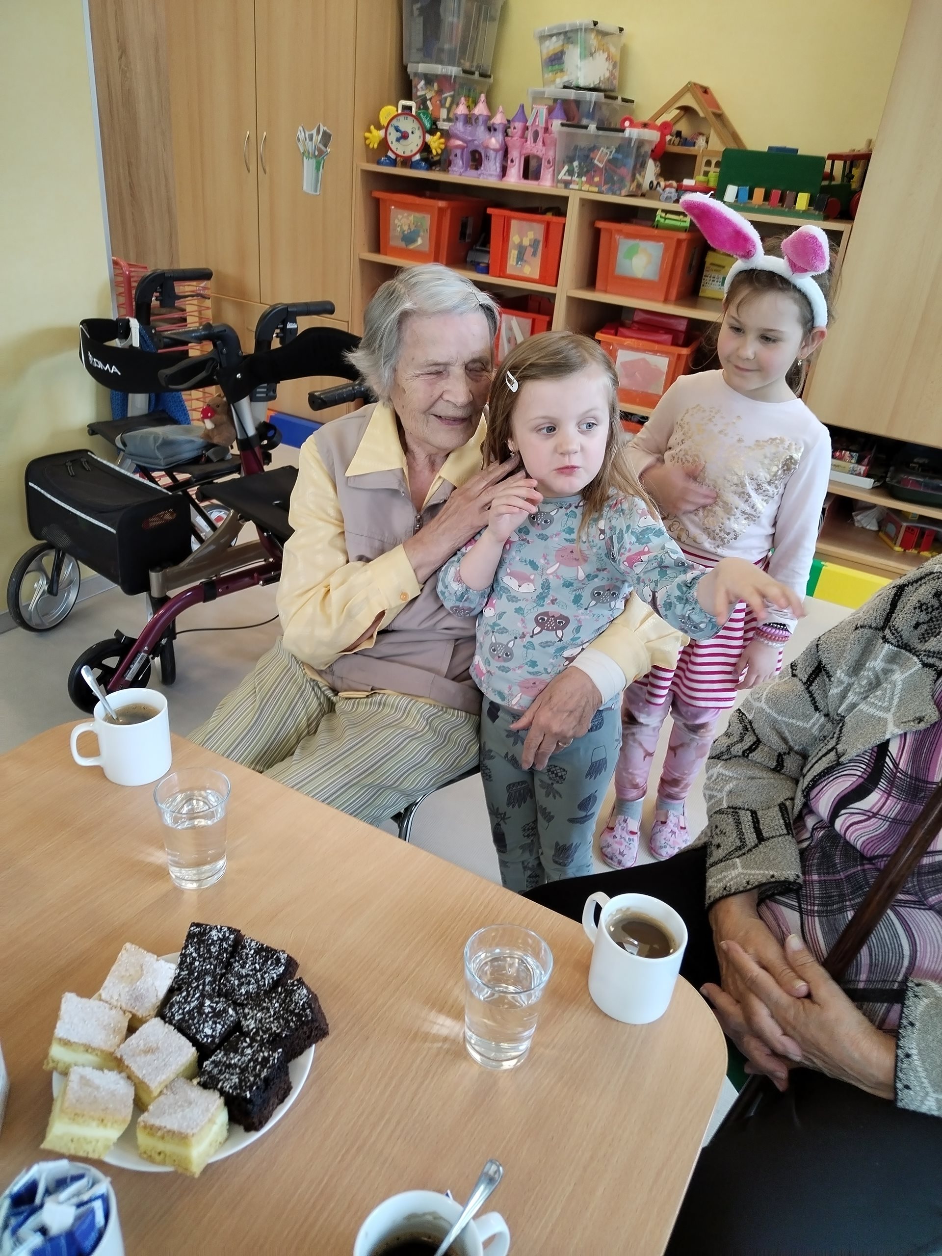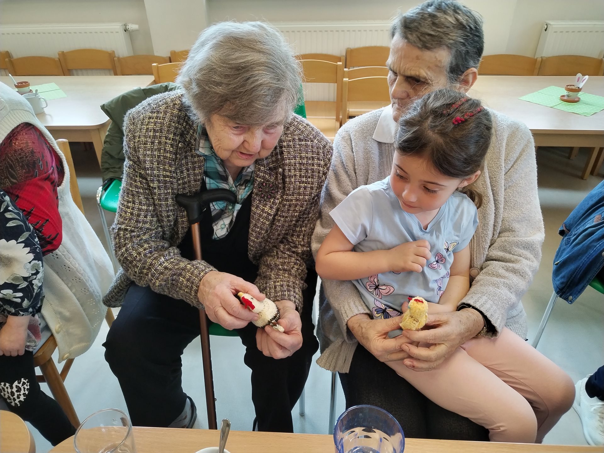 V týdnu před velikonočními svátky navštívili klienti MŠ Mostkovice. Čekaly na ně starší i mladší děti, které předvedly ukázku scénky Králíků z klobouku. Senioři si ve spolupráci s dětmi vyzkoušeli některé hry, například předávání vajíčka lžící. Dětem byly předány háčkované slepičky a kuřátko a velikonoční perníčky, které senioři upekli a nazdobili. Od dětí dostali velikonoční přání a výzdobu.