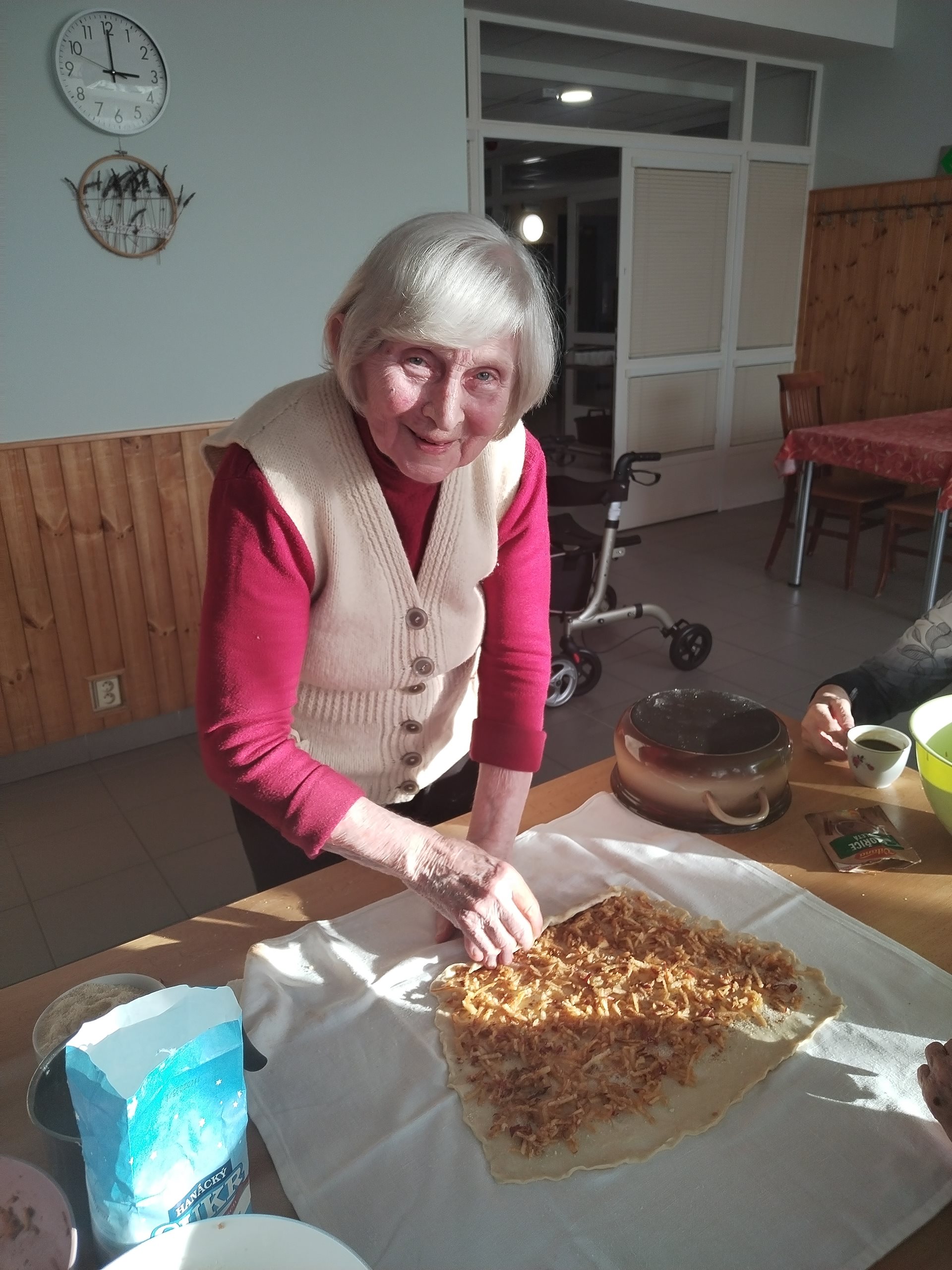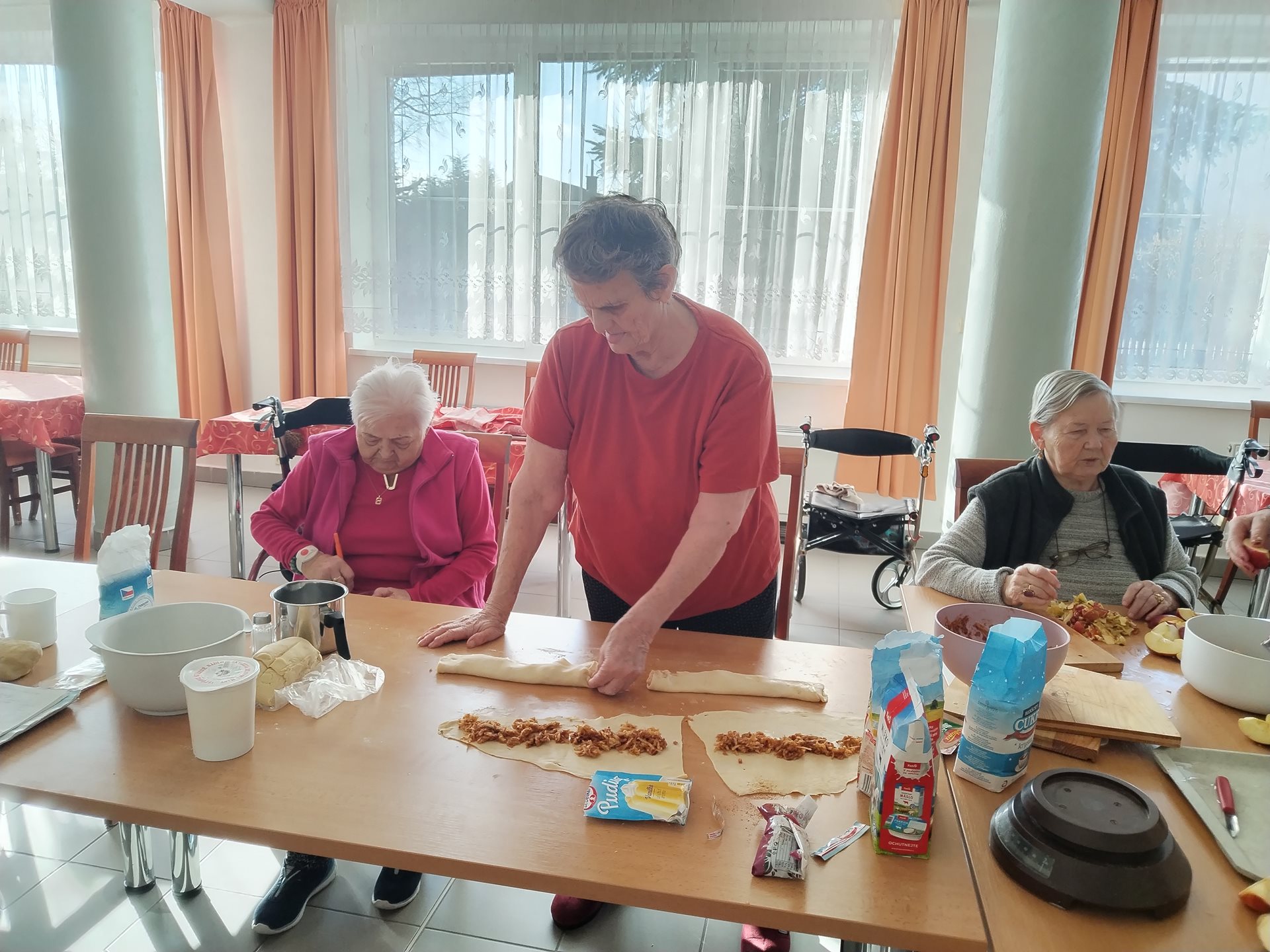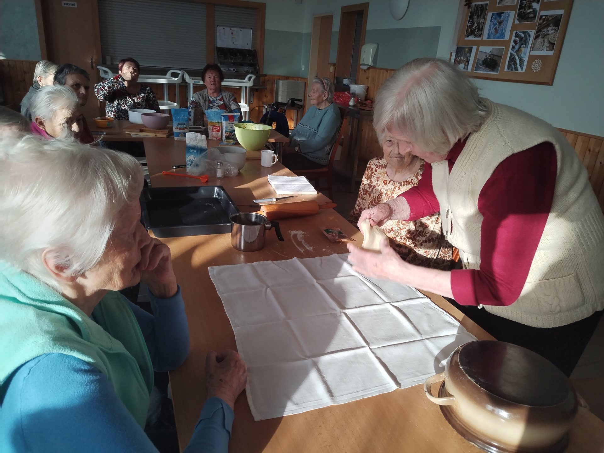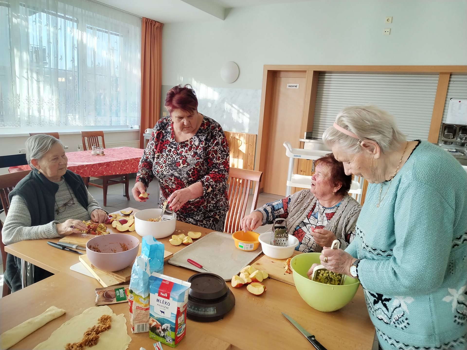 Zimní čas si klientky v domově krátí pravidelným pečením. Tentokrát přišly s nápadem upéct štrúdl podle jejich receptu. Pekl se tedy klasický, kynutý a také tažený štrúdl. Pečení se povedlo a tak bylo něco dobrého ke kávě.