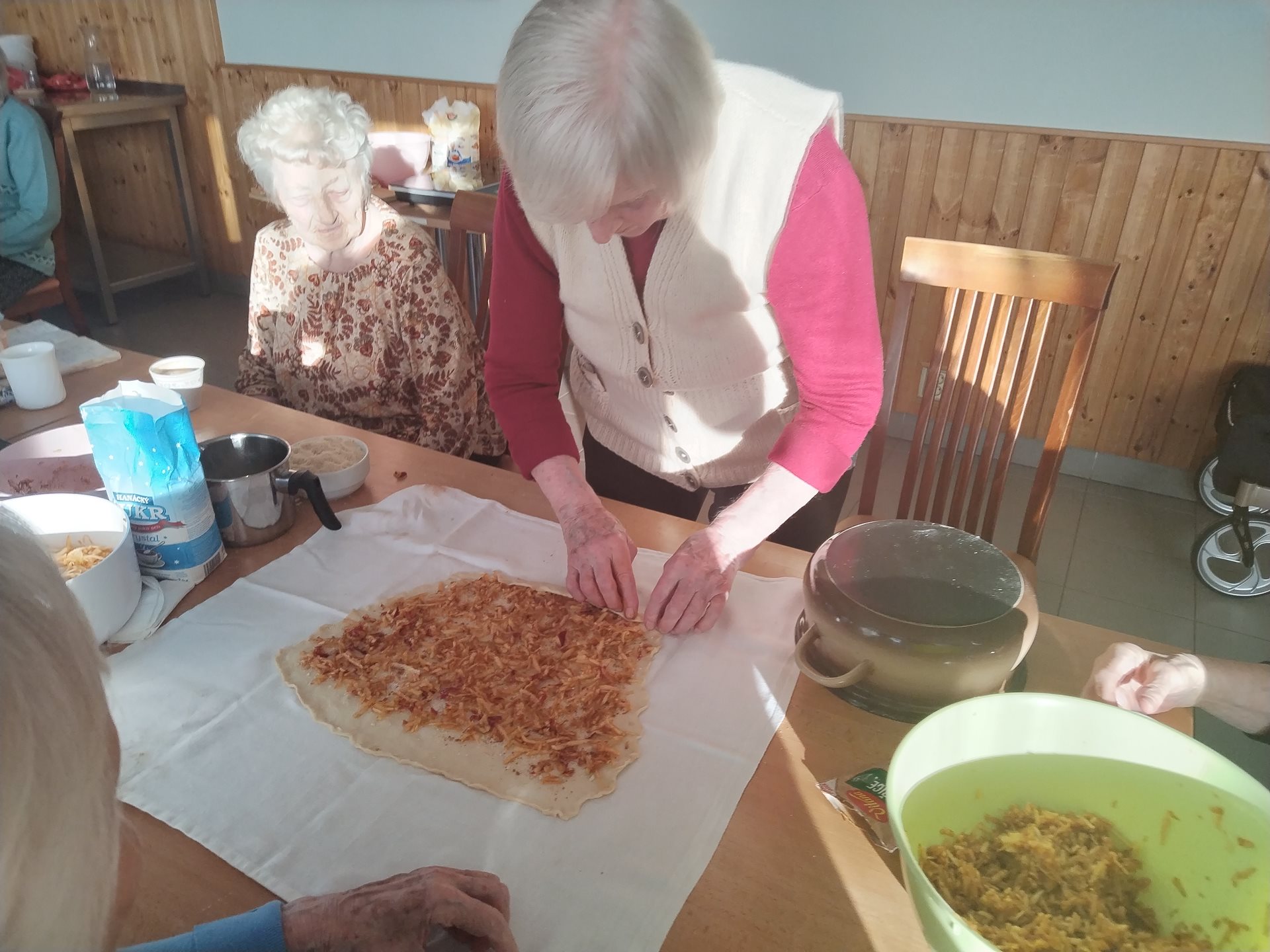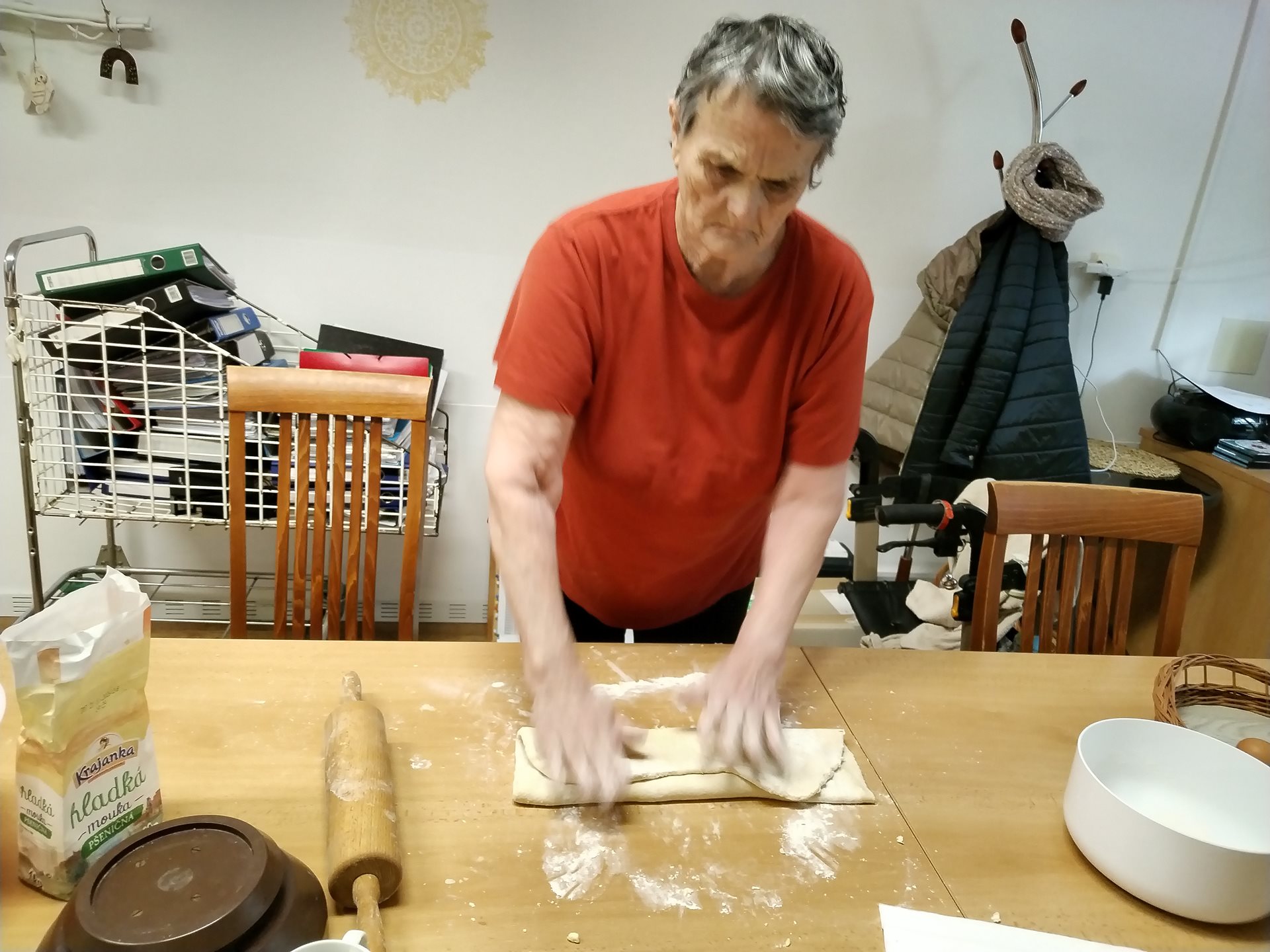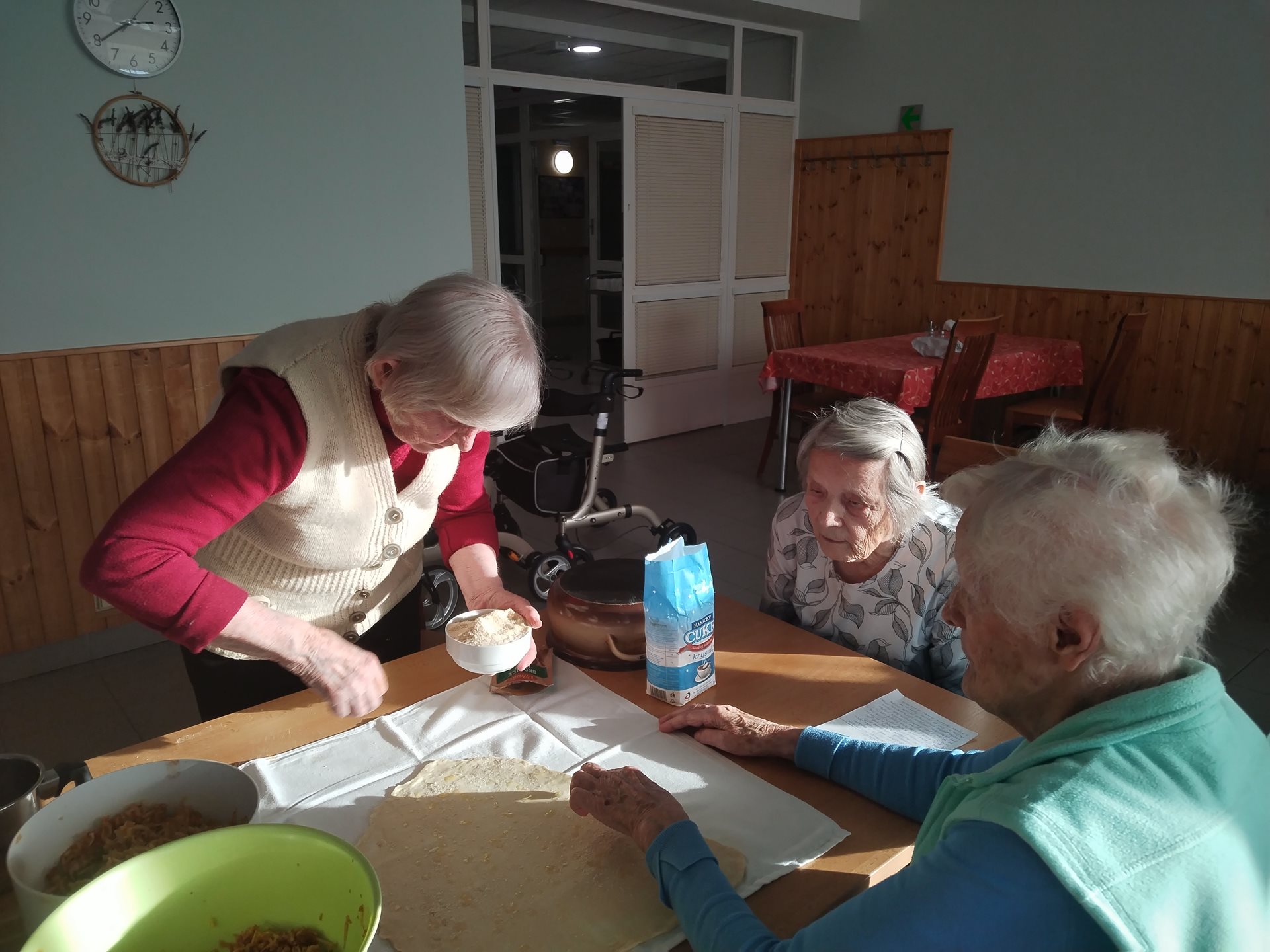Zimní čas si klientky v domově krátí pravidelným pečením. Tentokrát přišly s nápadem upéct štrúdl podle jejich receptu. Pekl se tedy klasický, kynutý a také tažený štrúdl. Pečení se povedlo a tak bylo něco dobrého ke kávě.
