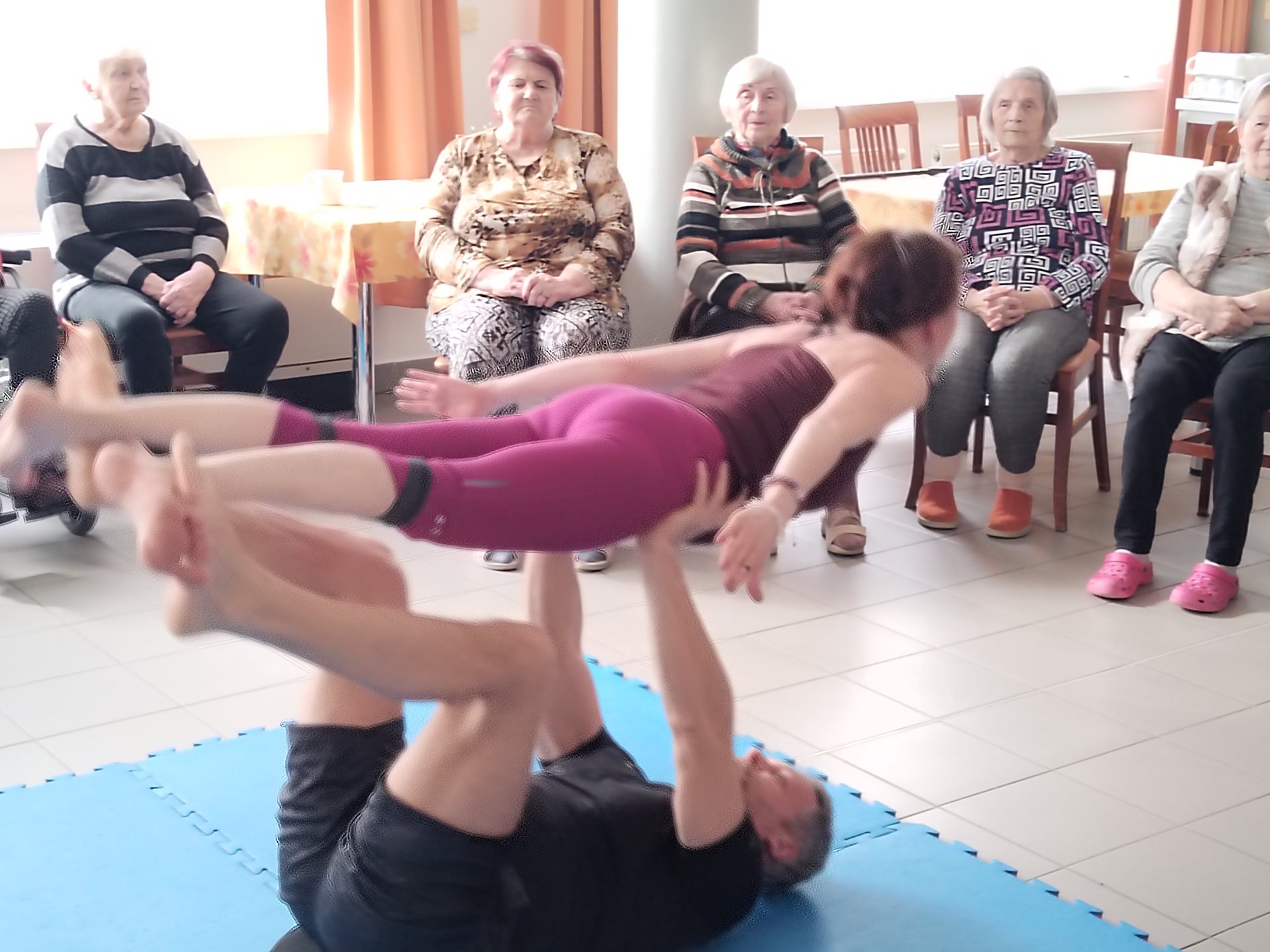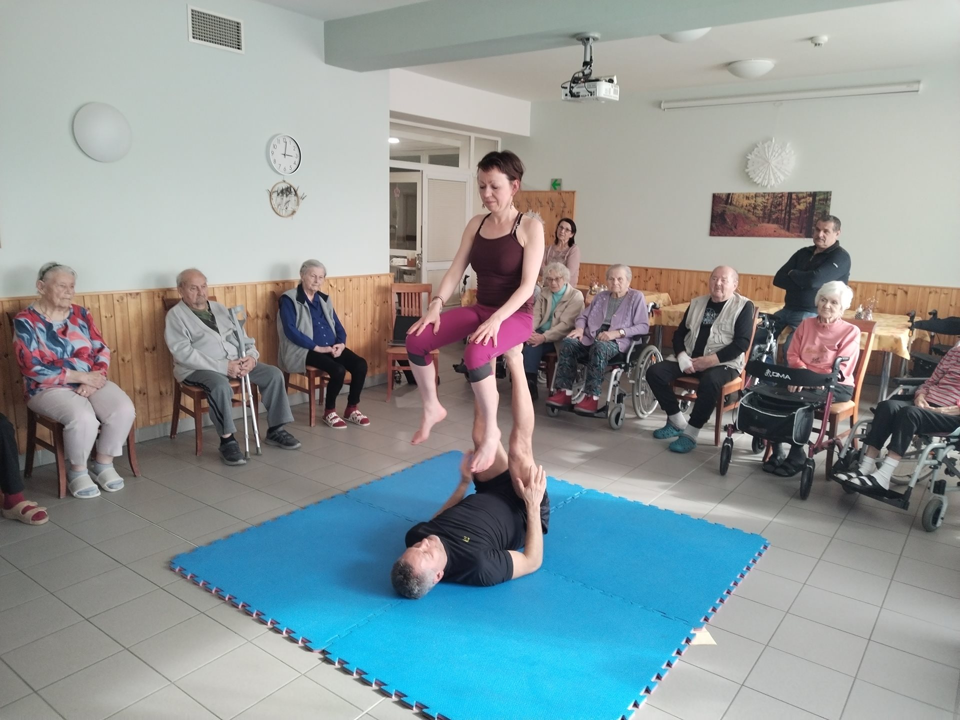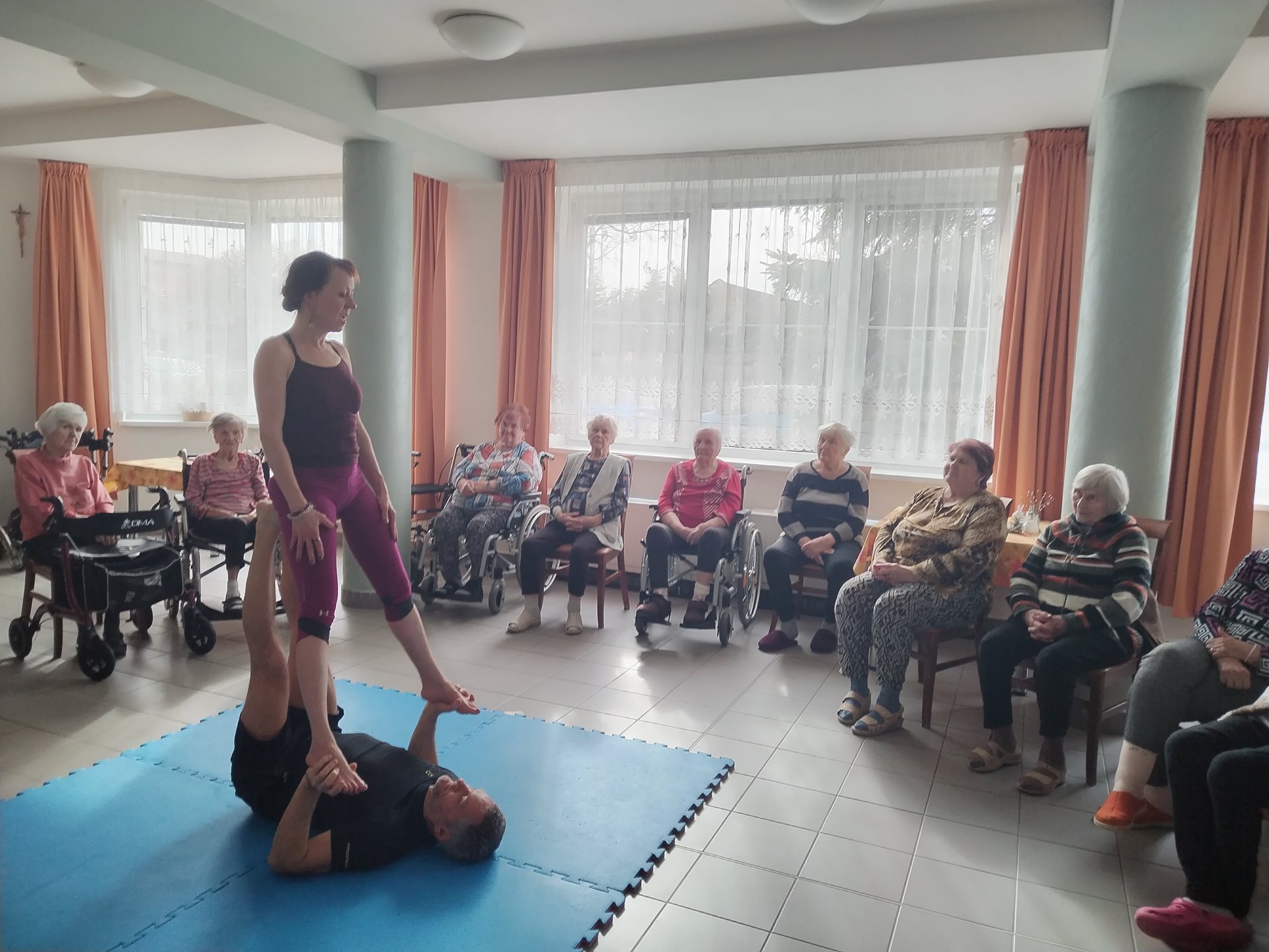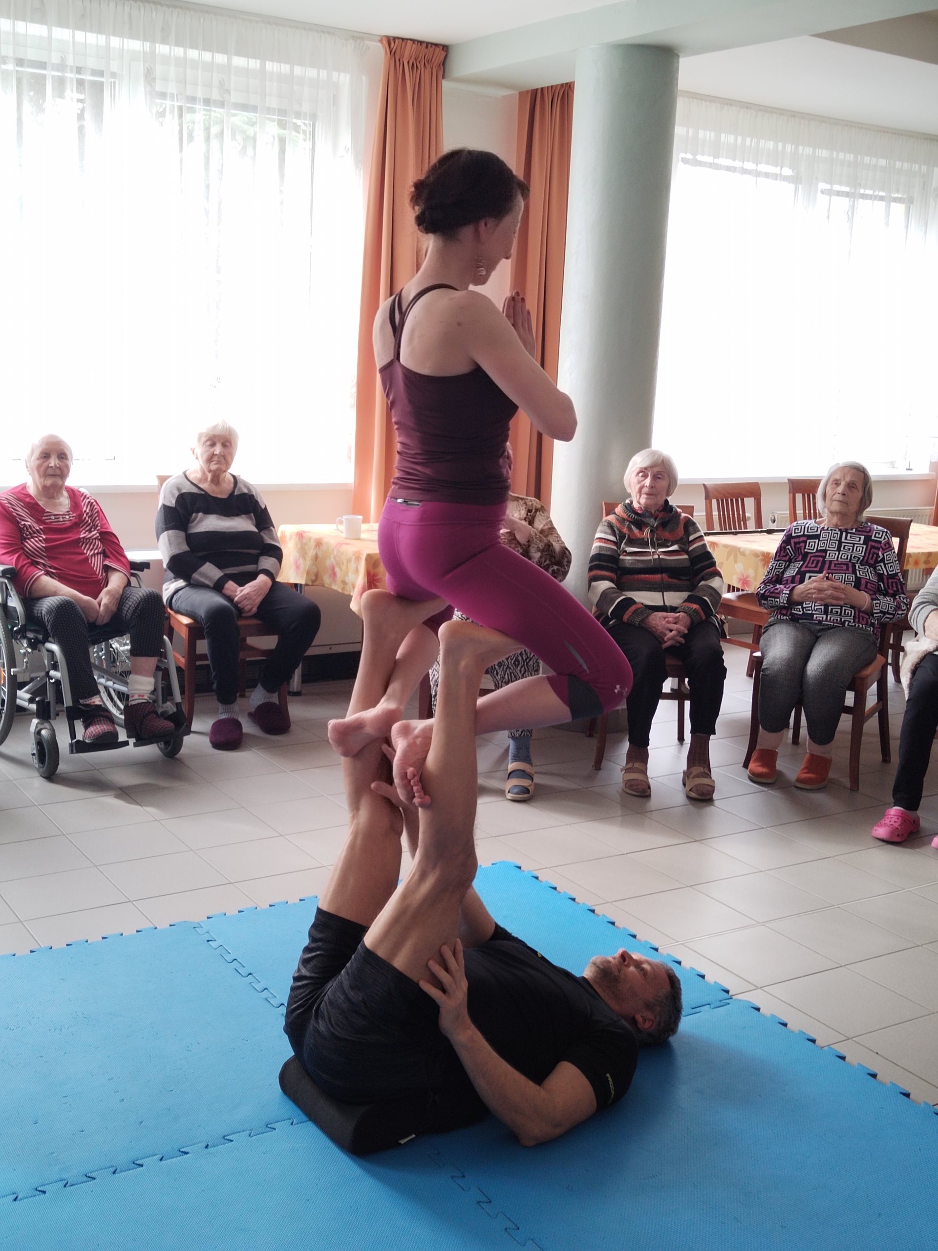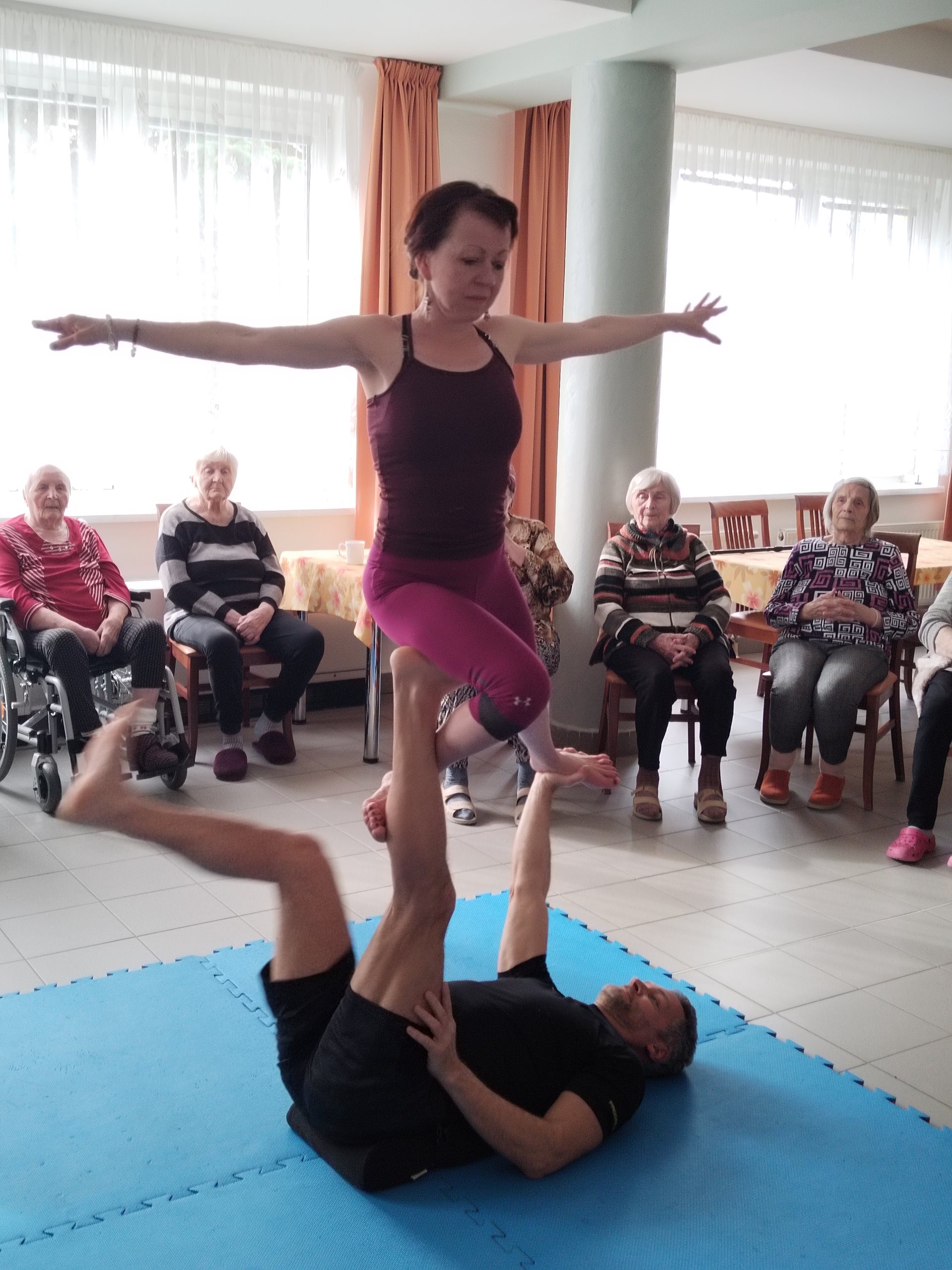 V minulém týdnu se v Domově pro seniory uskutečnila jedinečná akce, která přilákala pozornost nejen obyvatel, ale i jejich rodin. Cvičitelé Vlastimil a Jana přivezli do zařízení ukázku Acro jógy, která kombinuje prvky akrobacie a jógy a nabízí tak nejen fyzickou aktivitu, ale i zábavu a posílení mezilidských vztahů.